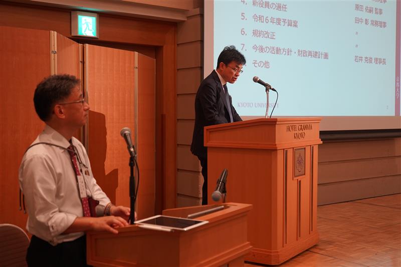 正副会長6名、理事18名(代理含む)、監事2名が出席しました。若井克俊理事長(経済学研究科長)のあいさつで始まり、令和5年度事業及び会計報告(田中彰常務理事・副研究科長)、同会計監査報告(原田佑嗣監事、H18)、新役員の選出、令和6年度予算案、規約改正案(以上、田中常務理事)の報告・提案について、いずれも拍手をもって承認されました。続いて若井理事長・田中常務理事より今後の活動方針として財政再建計画の提案があり、熱心な意見交換をへて承認され、総会に附議されることとなりました。