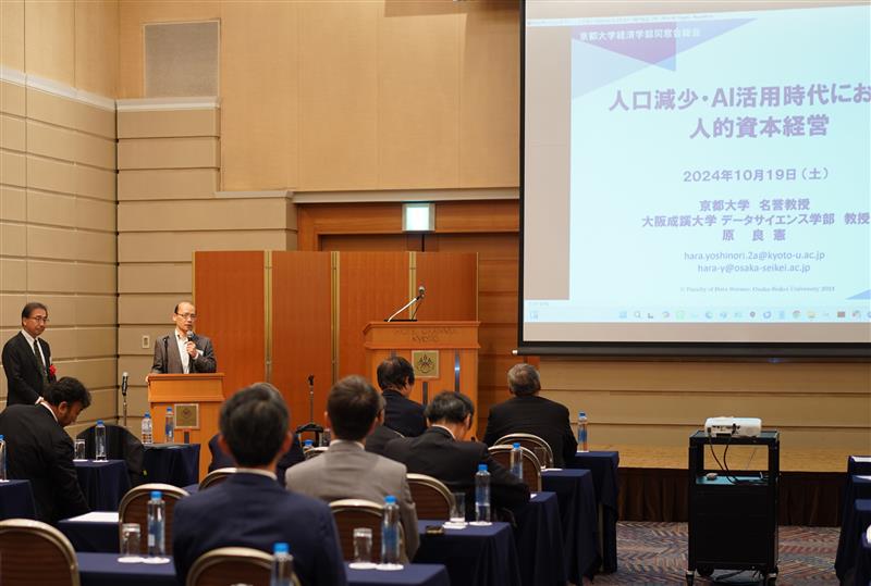 講演会は原良憲京都大学名誉教授・大阪成蹊大学データサイエンス学部副学部長・教授より、「人口減少・AI活用時代における人的資本経営」と題してなされました。
