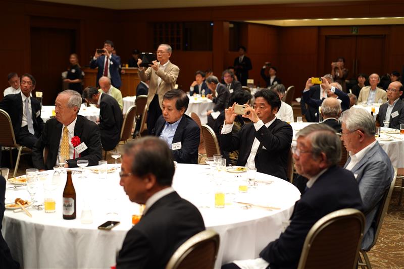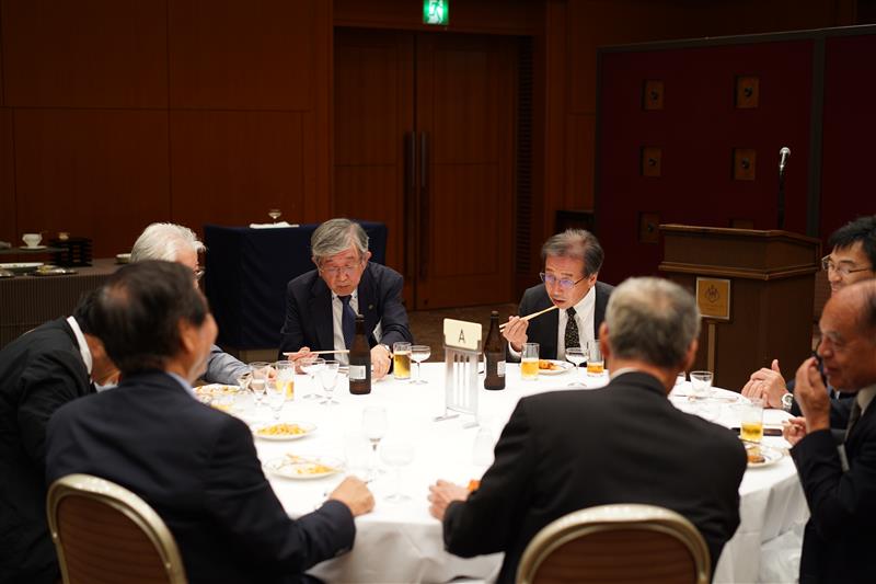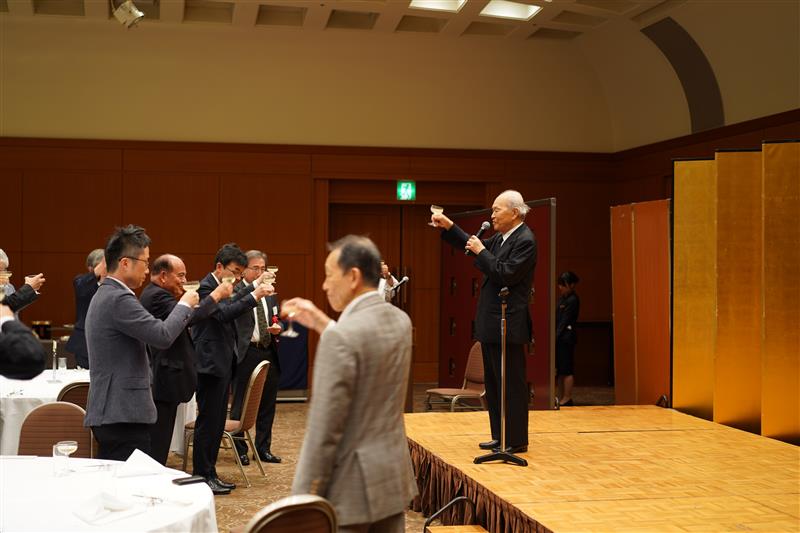 集合写真撮影の後、会場を移し、田中常務理事の司会により懇親会が始まりました。原名誉教授と11名の出席教員が紹介され、柄澤新会長による開会あいさつに続き、会場最年長・四方八洲男様(S38)のご発声により乾杯となりました。