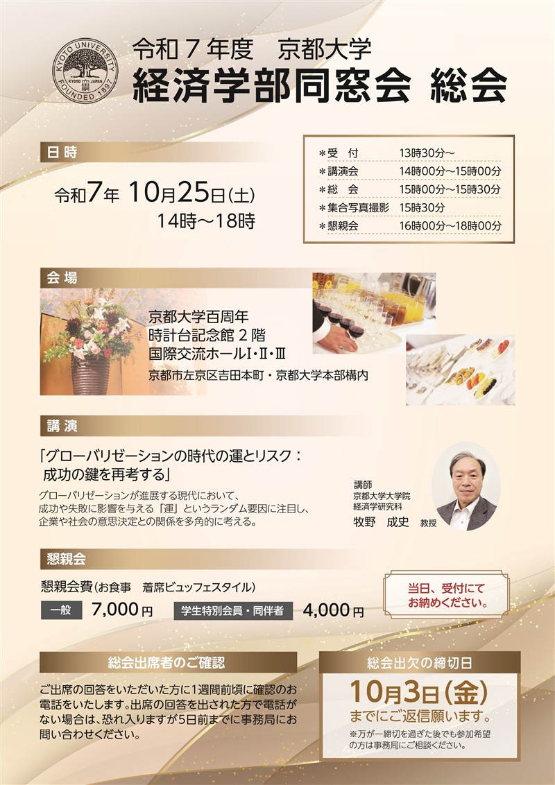 2025年度 京都大学経済学部同窓会 総会・講演会・懇親会(10月25日)のご案内