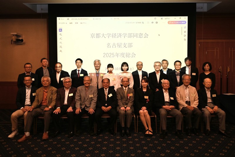 2025年10月4日(土)11時より、ホテルメルパルク名古屋にて、名古屋支部の総会・講演会・懇親会が開催されました。会員19名に加え、来賓として諸富徹教授(京都大学大学院経済学研究科)、同窓会事務局の田村利恵様、京大邦楽サークル「叡風会」のお二人をお迎えし、計23名が参加。和気あいあいとした雰囲気の中、楽しい会となりました。